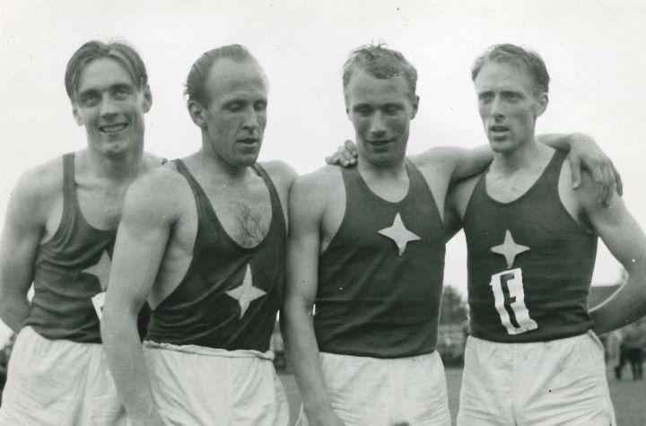 Tämä nelikko otti SM-kultaa 4x400mkolme vuotta peräkkäin 1950-luvun alussa. Vasemmalta Rolf Back, Lasse Räihä, Ossi Mildh och Rainer Pelkonen.